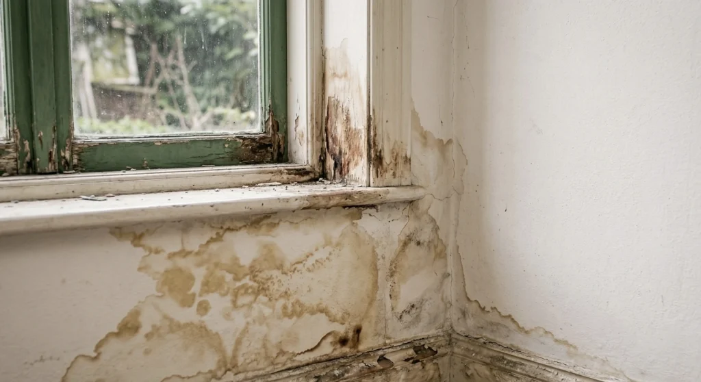 If you see yellowish or brownish stains on the wall under the window or on the wooden interior casings, that isn’t good news. If you can see staining on the inside of the window, you can be assured that the exterior of the window is probably already severely compromised because of the substantial amount of water that has already moved through the entire thickness of the window unit.